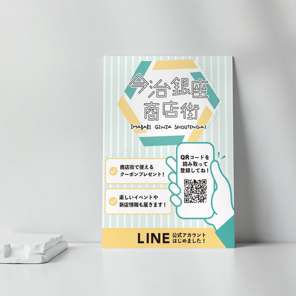 今治市の中心街、今治銀座商店街のLINE公式アカウントへの導線として、店舗様の店頭においていただく「店頭ポップ」を制作しました。 提供したもの 制作したもの 壁面掲... -